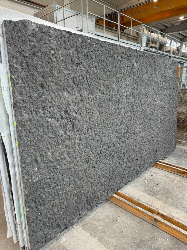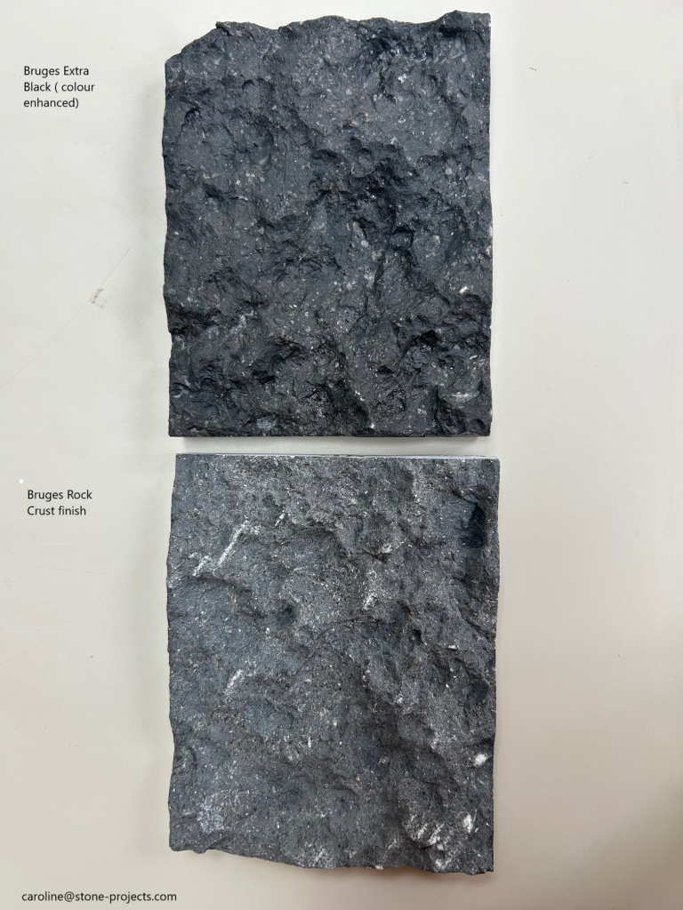E33 Bruges Rockcrust Supersize is an exciting addition to our portfolio of rough textured cladding. This black limestone has a deep rocky texture but maintains a thickness of just 40mm. It is available in large format, cut to size from full size slabs. The regular texture allows a more seamless look for larger areas such as stairwells. The stone is a charcoal grey with some small white fossil content . It can be made extra black with a colour enhancing sealant if required.