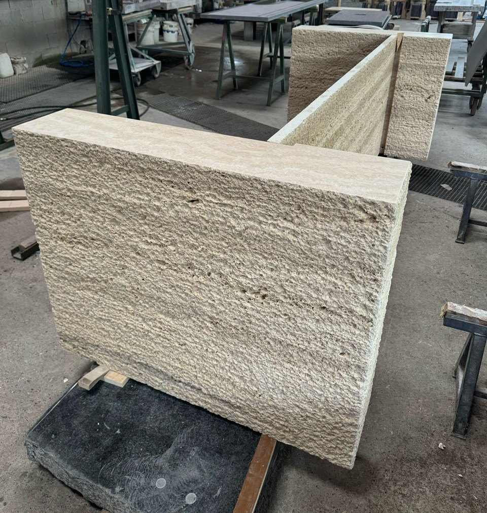 You can compare this to E11 Classic Light Roman Split Face Travertine which offers a more robust split face finish in 1200×600 panels that are 50-130mm thick.